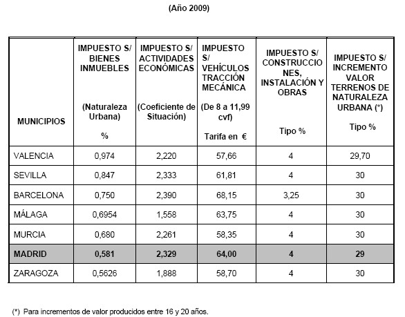 El Ayuntamiento de Madrid señala que, tomando como referencia el IBI -que es el que tiene más peso en los ingresos tributarios de los ayuntamientos-, la fiscalidad que aplica Alberto Ruiz Gallardón ocupa el puesto 24 entre las 52 capitales de provincia. Lérida, Tarragona y Ciudad Real, por este orden, son los municipios que ocupan los primeros puestos. Madrid oupa además el penúltimo lugar si tan sólo se consideran los siete mayores municipios de España -detrás de Madrid sólo está Zaragoza-.
