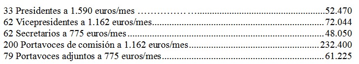 TOTAL: 466.189 euros al mes, a repartir entre 350 diputados (los cargos están muy repartidos y, de hecho, numerosos diputados ocupan alguno de estos cargos remunerados en varias comisiones). De este modo, el reparto otorga a cada diputado un sueldo medio extra de 1.332 euros limpios al mes (15.984 euros netos al año), ya que tampoco esta cuantía tributa a Hacienda.