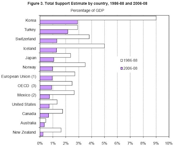 Nueva Zelanda, hasta hace 25 años, tenía un sector rural muy similar al de la UE, envejecido y muy dependiente de las subvenciones. Pero en 1984 decidieron iniciar una pequeña revolución. Hasta entonces, los subsidios representaban más del 30% del valor de la producción agrícola; hoy en día sólo representan el 1% (y en su mayoría están dirigidos a tema de investigación y desarrollo).