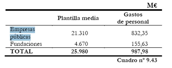 Ahora bien, si tomamos los datos de la Cámara de Cuentas, no actualizados convenientemente en el año 2010, sobre el costo de empresas públicas y fundaciones, el gasto de personal de las empresas públicas señalado es de 832.350.000 euros, y entre los 21.310 trabajadores de estas empresas tenemos que salen a 39.059 euros de gastos de personal de media por cada trabajador.