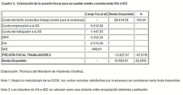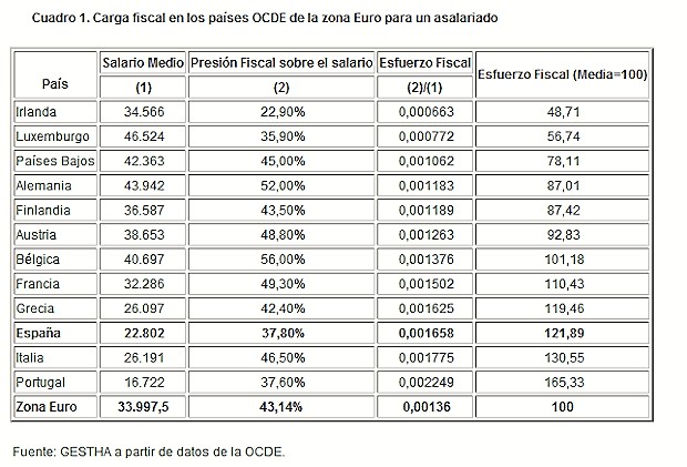 Los trabajadores españoles soportan un esfuerzo fiscal superior al de sus vecinos europeos, a excepción de Italia y Portugal, ya que, aunque la presión fiscal sobre las rentas del trabajo en España es ligeramente menor a la media europea, el salario medio anual es menor en comparación con el de los países de la zona euro.
