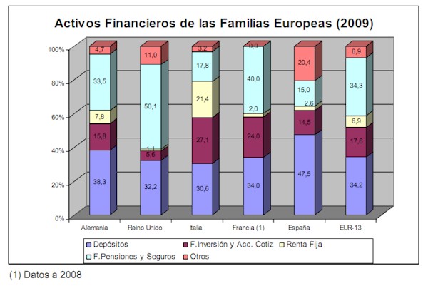 Lo primero que sorprende al examinar cómo ahorran los españoles es la baja proporción de instrumentos de inversión frente al alto porcentaje de depósitos y efectivo que tienen en su poder. Así, esta última categoría supone el 48% de los activos financieros de las familias españolas frente a un 34% de media en la eurozona. Por el contrario, fondos de inversión y de pensiones suman algo menos del 30% del total del ahorro, mientras que sus vecinos tienen dedicados a estos menesteres por encima del 50% (ver gráfico con datos de Inverco).