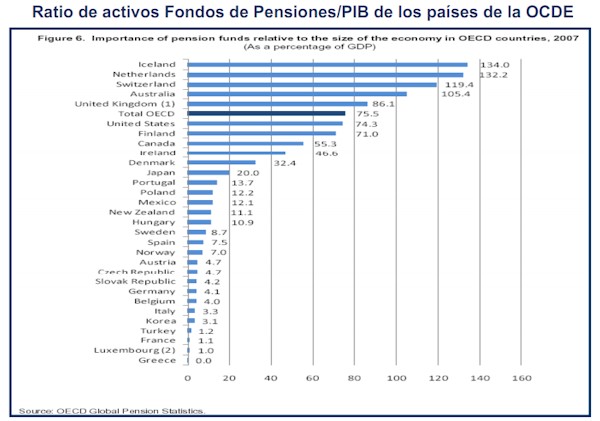 A finales de 2010, los fondos de pensiones en España acumulaban un patrimonio de algo más de 84.000 millones, aproximadamente un 8% del PIB. Es una cifra que puede parecer elevada pero que se queda a años luz de la que ofrecen algunos de sus vecinos. La media en los países de la OCDE es del 75% y algunos, como Holanda, Suiza o Australia tienen por encima del 100% del PIB si se suman todos los activos incluidos en sus fondos. Es cierto que España no es un caso completamente aislado (Francia, por ejemplo, apenas suma un 1% del PIB), pero resulta significativo que en un país que está acometiendo su tercera reforma de las pensiones en los últimos 25 años, las instituciones financieras no sean capaces de captar el ahorro para la jubilación de sus ciudadanos.
