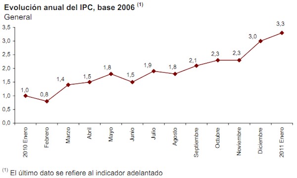 2. Inflación: Este lunes se ha sabido que el Índice de Precios de Consumo (IPC) ha alcanzado en enero el 3,3%, el nivel más alto desde mediados de 2008. Normalmente, las crisis van acompañadas de moderación en los precios, sin embargo, la subida del petróleo y las materias primas han impulsado los precios en los últimos doce meses (en febrero de 2010 este índice marcaba un 0,8%).