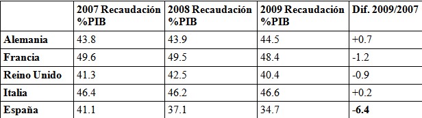 Como podemos ver en la tabla y gráfico adjuntos, la evolución de la recaudación en los países de nuestro entorno ha sido bastante homogénea a lo largo de la crisis, oscilando en una horquilla que va desde un aumento de 7 décimas del PIB en Alemania hasta una caída de 1,2 puntos en Francia. Sin embargo, en España el desplome ha sido nada menos que 6,4% del PIB. En Irlanda, un país devastado por la crisis y con una burbuja inmobiliaria aún más gigantesca que la nuestra, la recaudación sólo ha caído 2,3 puntos porcentuales.