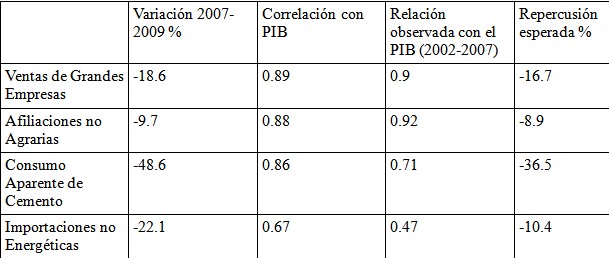 Otros datos apuntan también en que ésta es probablemente la explicación correcta. El Ministerio de Economía publicó en 2007 un estudio en el que analizaba la correlación entre diversos indicadores parciales y el PIB. Entre ellos, destacan las ventas de grandes empresas, las afiliaciones no agrarias, el consumo aparente de cemento y las importaciones no energéticas. En la tabla adjunta se puede observar la correlación en el período estudiado (1995-2006) y la caída de estos indicadores entre 2007 y 2009.