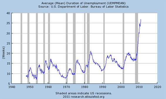 Un gráfico que ilustra esta cruda realidad reciente del mercado de trabajo norteamericano es el siguiente, que muestra la duración (en semanas) media de los desempleados desde 1950.