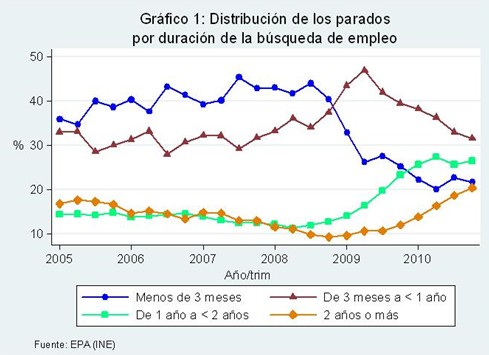 Los miembros de este desafortunado grupo son aquellos que llevan más de 27 semanas sin empleo. Conforman cerca del 45% de todos los desempleados, mientras que aquellos parados que llevan menos de 5 semanas en esta situación constituyen cerca del 20%.
