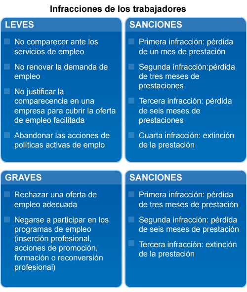 Ya hay vigentes las siguientes sanciones por no seguir las indicaciones de los SPEE, pero lo que cambia es el significado de las expresiones "políticas activas de empleo" o "programas de empleo" (ver cuadro con las disposiciones de la Ley de Infracciones y Sanciones del Orden Social):