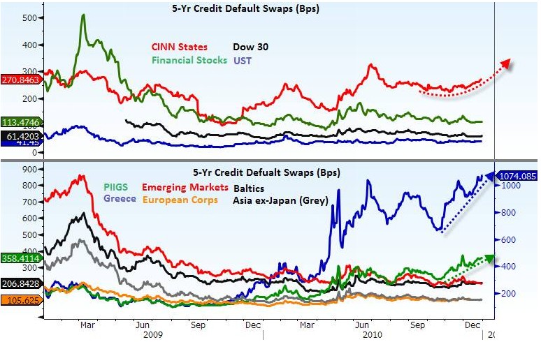 Algunos ya apodan a este grupo bajo el título de los estados CINN, en contraposición a los famosos PIIGS europeos (Portugal, Irlanda, Italia, Grecia y España). En este sentido, los credit default swaps (CDS), un seguro para garantizar inversiones en deuda, de los CINN lleva tiempo repuntando en comparación con otros activos, signo inequívoco de que ostentan un mayor riesgo de quiebra.
