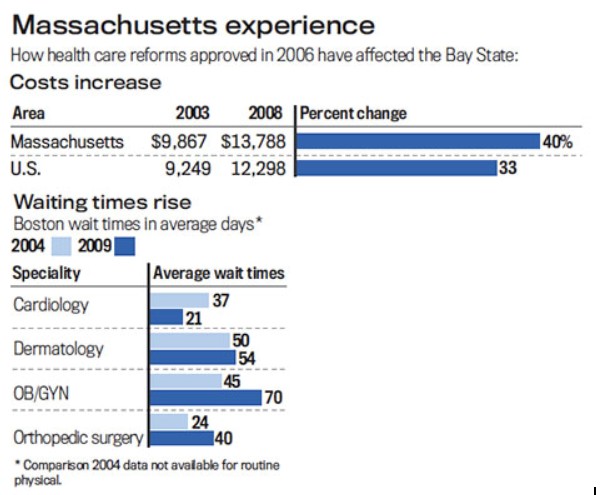 Michael Cannon, en otro artículo para Detroit News (Massachusetts' Obama-like Reforms Increase Health Costs, Wait Times), hacía referencia a las estadísticas de un estudio de Merritt Hawkins: en 2004, Boston ya tenía una de las listas de espera más largas de entre las áreas metropolitanas. En 2009, las listas se han reducido en las otras ciudades (menos de tres semanas de espera media), pero se ha prolongado en Boston (siete semanas).
