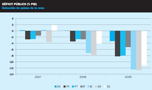 Los estímulos fiscales propios de la “ortodoxia keynesiana” han provocado que el Gobierno pasase de presentar un superávit del 1,9% del PIB en 2007 a un déficit superior al 11% en 2009, al tiempo que el endeudamiento público se “ha incrementado notablemente, pasando del 36% del PIB al comienzo de la crisis a superar 50% en 2009, y superará con creces el 60% a lo largo de 2010”.