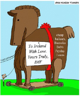 Los ciudadanos irlandeses no deberían tolerarlo, y no lo harán. Hice algunas sugerencias para el próximo Parlamento irlandés en mi post Irish Government Collapses, Six Cabinet Members Resign, Election March 11; How To Negotiate Haircuts (El gobierno irlandés colapsa, seis miembros del gabinete dimiten, elecciones el 11 de Marzo: Cómo negociar las quitas). En general, así es cómo veo el Caballo de Troya en forma de rescate a Irlanda del Fondo Monetario Internacional.