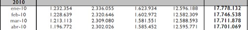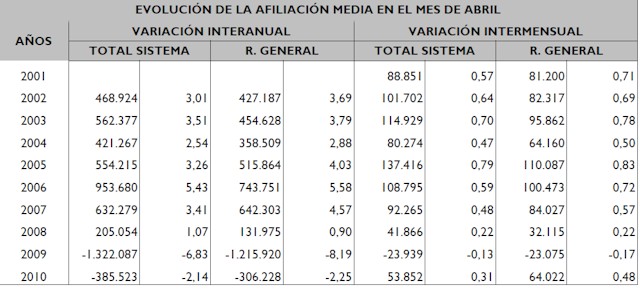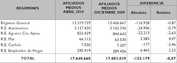 Por otro lado, los datos también desmienten a Granado cuando afirma que España ha logrado crear más de 100.000 empleos desde Navidades. Más bien todo lo contrario. Según el informe oficial, “el número medio de afiliados de abril de 2010 presenta un decremento para el Total del Sistema de 155.179 afiliados y una tasa respecto a los afiliados medios de diciembre de 2009 del -0,87%”.