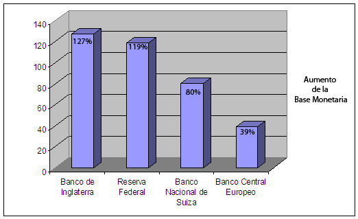 Pero los norteamericanos no son los únicos que han entrado en el juego de ampliar la base monetaria para rescatar a los jugadores más ineficaces del mercado. En el gráfico inferior se ve el aumento de la base monetaria efectuado este año por la FED y sus homólogos, europeo, británico y suizo.