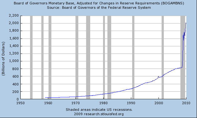 La base monetaria se ha doblado en el último año, se ha triplicado desde el año 2000 y se ha multiplicado por siete desde que Alan Greenspan, mentor de Ben Bernanke, se hiciese con la presidencia de la Reserva Federal. Como premio a una espiral semejante la revista Time ha nombrado “Hombre del año” 2009 al aventajado discípulo de Greenspan.