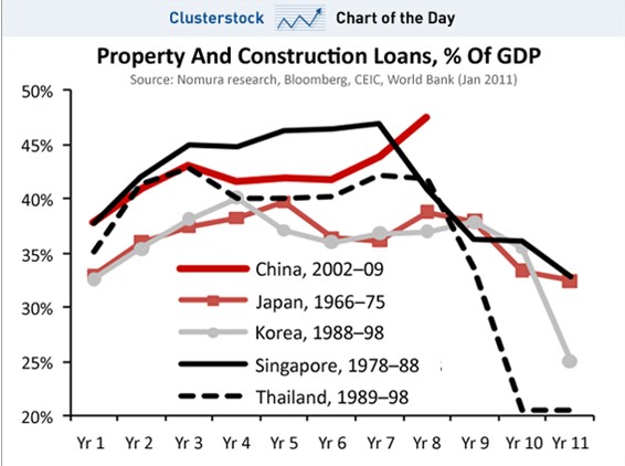 Según un reciente artículo del Financial Times, "China tiene hoy las características de una burbuja verdaderamente grande. El valor del stock inmobiliario se estima que excede el 350% del PIB de este año, el mismo nivel que Japón en el pico de su burbuja inmobiliaria. El sector de la construcción representa alrededor de un cuarto de la actividad económica en China, que resulta que es el mismo nivel que en Irlanda antes de su dramático desplome".