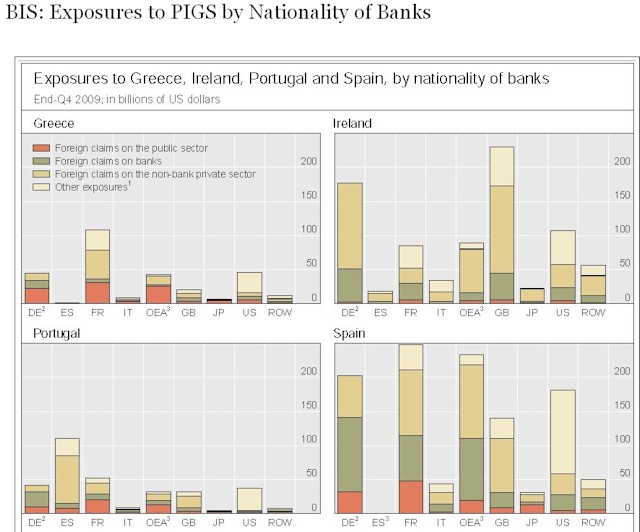 Las empresas (incluidos bancos), particulares y administraciones públicas de Portugal, Irlanda, Grecia y España (los denominados PIGS, aunque también se suele incluir a Italia en este club) debían casi 1,6 billones de dólares a los bancos de la zona euro a finales de 2009, según el último informe del Banco Internacional de Pagos (BPI), el banco de los bancos centrales: España debe 727.000 millones de dólares (590.000 millones de euros), Irlanda 402.000 millones; Portugal 244.000 y Grecia 206.000.