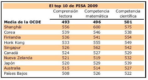 En su última edición, la de 2009 (aunque sus resultados se dieron a conocer hace apenas un mes), los estudiantes españoles han sacado 481 puntos en Comprensión Lectora, 483 en Competencia Matemática y 488 en Ciencia. Las medias de la OCDE son de 493, 496 y 501 respectivamente. Y aún más destacada es la diferencia con las calificaciones en otros países de la UE, como Finlandia (536, 541 y 554) u Holanda (508, 526 y 522).