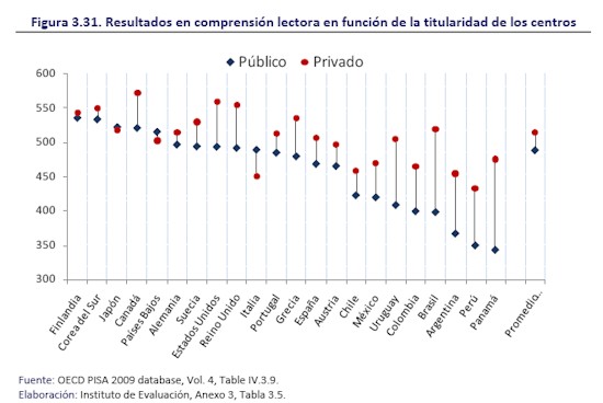 Sin embargo, un repaso detallado a los resultados no deja tan clara esta cuestión. En primer lugar, en prácticamente todos los países analizados (ver gráfico 3) las escuelas privadas sacan notas mucho más altas que las públicas. En segundo lugar, y en sintonía con lo anterior, los sistemas con mayor porcentaje de centros privados son, en su gran mayoría, muy exitosos (Holanda, Corea, Japón o, incluso, Chile, el país sudamericano con mejores notas).