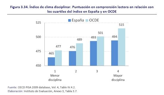 Otras de las cuestiones más recurrentes cuando se habla de la calidad de la educación tiene que ver con la disciplina en las aulas. También en este ámbito, PISA es concluyente: "Las diferencias de los alumnos que se sitúan en los cuartiles extremos, es decir, los correspondientes a las situaciones de menor y mayor disciplina en las aulas, es considerable, tanto en la OCDE como en España". En nuestro país, los colegios en el cuartil inferior (el 25% de los centros con menos carga disciplinaria) sacan 465 puntos en lectura, mientras que los que se sitúan en el cuartil superior (los más estrictos) obtienen 494 puntos.
