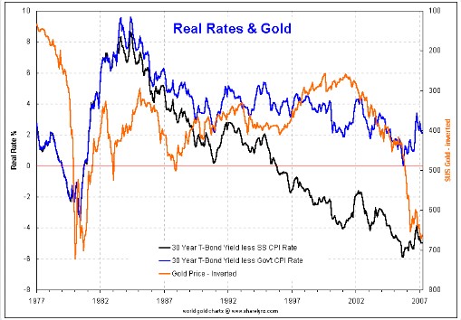 En esta gráfica se muestra la cotización del oro (en naranja) invertida sobre el eje vertical de la derecha, los tipos de los bonos del tesoro a 30 años menos el IPC americano a la izquierda (en azul) y los mismos tipos menos el IPC alternativo calculado por John Williams de Shadow Stats (en negro) también sobre el eje vertical izquierdo.