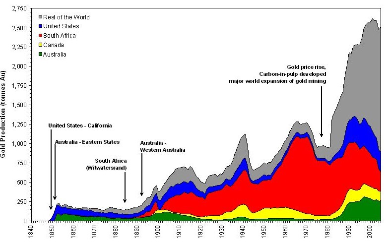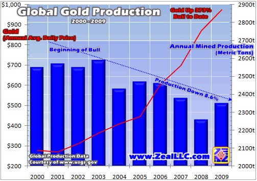 - El oro ha alcanzado su máximo mundial de producción y esto tiene que afectar necesariamente a su precio, por cuanto supone desabastecimiento. Este es un hecho incontestable y excelentemente documentado por Jean Laherrère aplicando las linearizaciones de Hubbert (1 y 2). También ha sido comentado de forma magistral por Antal Fekete (1, 2 y 3). Aquí hay más información sobre la producción mundial.
