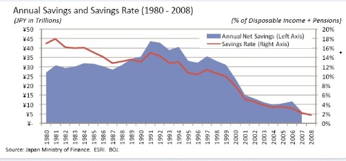 Y como sucede en Japón, esto afecta al ahorro privado, que simplemente desaparece por el desapalancamiento de los particulares y también porque este sector busca otras formas de ahorro al dejar de ser atractiva la moneda local por los bajos tipos de interés y la creciente presión fiscal del gobierno para poder honrar la deuda que emite.