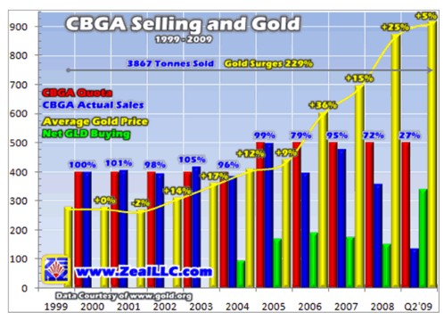 Se aprecia claramente una correlación (especialmente sobre la línea negra) que concluye en 1996 y vuelve a aparecer en 2007. ¿Por qué? Ya hemos comentado antes que las ventas de los bancos centrales se hicieron con objeto de aminorar la revalorización del oro. Destacaba entre todas las realizadas por el Banco de Inglaterra. Y, en efecto, el propio Gobernador Edward A. J. George dijo al director del BIS Nicholas J. Morrel lo siguiente: