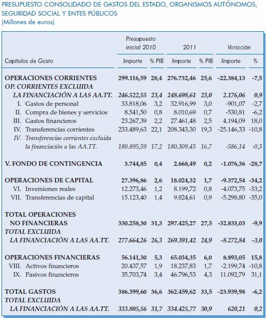 La previsión de gastos no financieros del Presupuesto Consolidado (Estado, Seguridad Social, Organismos Autónomos y otros entes públicos de la Administración Central) asciende a 297.425 millonesde euros, un 9,9% menos que en los PGE-2010.