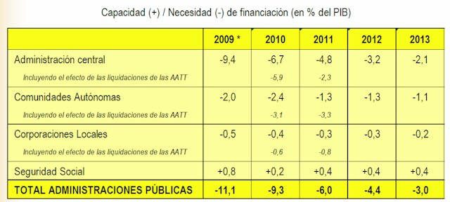 Por último, el Gobierno también maquilla las necesidades financieras del Estado (déficit). Así, prevé un déficit para el conjunto de las Administraciones Públicas del 6% del PIB en 2011 frente al 9,3% previsto para el presente año. En concreto, el déficit del Estado (Gobierno central) será del 2,3% del PIB (24.387 millones de euros) mientras que el de las CCAA será del 3,3% (más de la mitad del total).