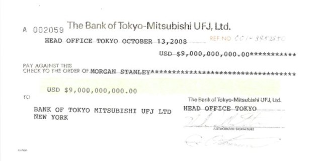 Se trata, posiblemente del mayor cheque de la historia. Y ya es visible. Lo recoge Andrew Ross en su libro Too big to fail (Demasiado grande para caer). El citado talón, por valor de 9.000 millones de dólares, fue expedido por el grupo japonés Mitsubishi UFJ en octubre de 2008 para hacerse con el 21% del banco estadounidense Morgan Stanley, gravemente afectado por la crisis financiera.