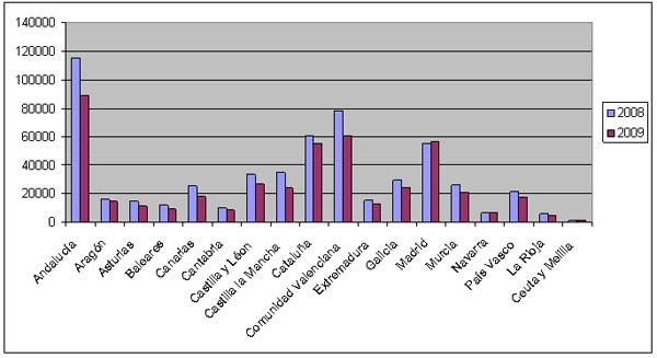 Cuatro comunidades autónomas concentran el 58% del total de las transacciones en el cuarto trimestre de 2009: Andalucía (24.052), Comunidad de Madrid (17.968), Cataluña (17.030), Comunidad Valenciana (16.807).
