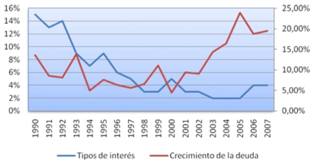 Sin embargo, la respuesta cambiaría si introducimos en el análisis factores fundamentales, y que más de una vez se dejan en el tintero. Y es que, no es casualidad que fuera a partir de 2002 cuando el endeudamiento privado comenzara a crecer exponencialmente. Una de las razones principales, aunque no la única, serían los tipos de interés artificialmente bajos que mantuvo el Banco Central Europeo durante demasiado tiempo, de los cuales nos ‘beneficiamos’ con la entrada en el euro.