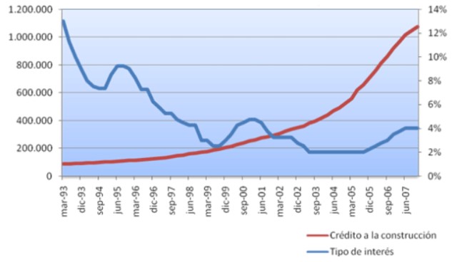 Así, con rebajas de los tipos oficiales al 2%, por un lado, el coste del endeudamiento se reduce considerablemente, y por otro, aumenta el valor presente de las inversiones futuras. El resultado general es que se aumenta notablemente el atractivo de incurrir en deuda. La influencia de los tipos de interés sobre la expansión del crédito a la construcción, sector más afectado por ésta, también fue analizada por el OCE en otro informe.