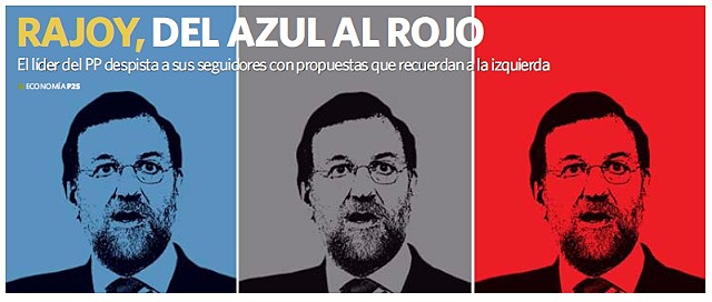 En páginas interiores va más lejos: "la reconversión de Rajoy: de opositor azul a candidato rojo: asesorado por Pedro Arriola, Mariano se ve empujado a dar una pasada al Gobierno por la izquierda". El diario hace referencia a las propuestas del PP en materia laboral y fiscal, especialmente en los feudos regionales, donde apoya que las cajas de ahorros oculten sus vergüenzas con dinero de todos los españoles. "Los herederos de Aznar se apuntan al partido de los trabajadores para apuntalar a un líder sin carisma".