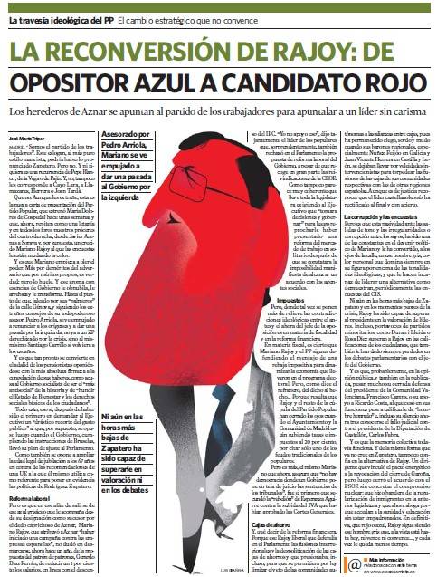 En páginas interiores va más lejos: "la reconversión de Rajoy: de opositor azul a candidato rojo: asesorado por Pedro Arriola, Mariano se ve empujado a dar una pasada al Gobierno por la izquierda". El diario hace referencia a las propuestas del PP en materia laboral y fiscal, especialmente en los feudos regionales, donde apoya que las cajas de ahorros oculten sus vergüenzas con dinero de todos los españoles. "Los herederos de Aznar se apuntan al partido de los trabajadores para apuntalar a un líder sin carisma".