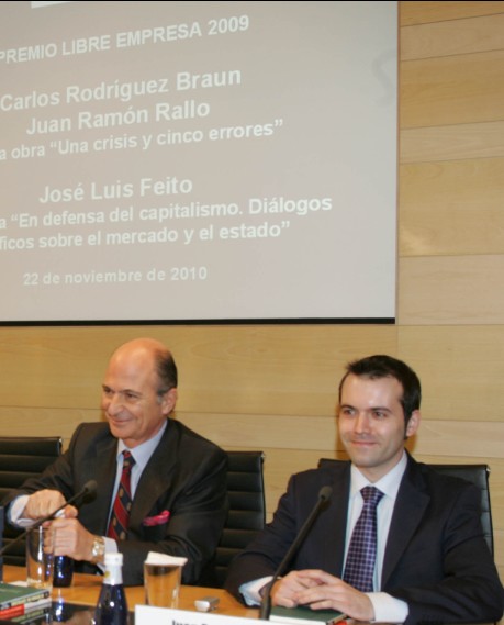 La Fundación Rafael del Pino ha celebrado este lunes el acto de entrega del Premio Libre empresa 2010, concedido, ex aequo, a los libros Una crisis y cinco errores, de Carlos Rodríguez Braun y Juan Ramón Rallo, y En defensa del capitalismo. Diálogos filosóficos sobre el Mercado y el Estado, de José Luis Feito el Premio Libre Empresa correspondiente al año 2010.
