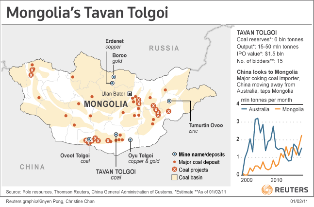 Tavan Tolgoi tiene el carbón metalúrgico que podría abastecer de momento la fuerte demanda china para producción de acero. Un volumen que los dos últimos años estaba cubriendo su mercado interno más las importaciones de Australia. No obstante, está tan ajustado el mercado que esos yacimientos son una golosina para cualquier empresa minera. De momento, los bancos que van a participar en la Oferta Pública (IPO) son Deutshe Bank, Goldman Sachs, BNP Paribas y Macquarie. Más información en esta noticia de Reuters.