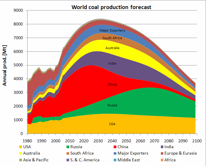 La universidad de Uppsala trabajó sobre los datos disponibles y modelizó las previsiones que se encuentran en el trabajo de BP, pero sólo para el carbón. Los resultados se encuentran en este estudio y su síntesis gráfica es la que aparece en la gráfica inferior. Como la producción mundial declina a partir de 2030 (junto con la de petróleo), se comprende fácilmente porque BP sólo enseña sus previsiones hasta esa fecha.
