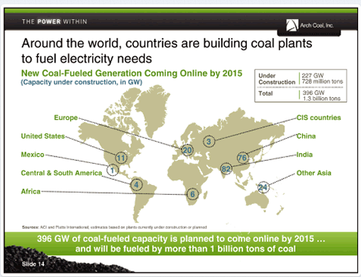 Están construyéndose centrales térmicas en todo el mundo que incorporarán una generación eléctrica de 227 GW y demandarán unas 728 MTm nuevas de carbón. Pero están proyectados unos 396 GW, que demandarán la friolera de 1.300 MTm de carbón.