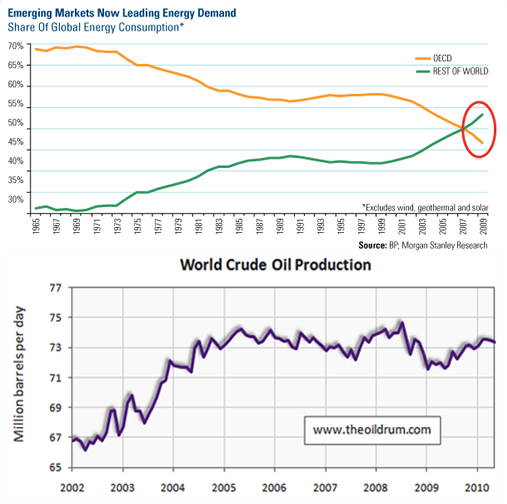 Pero realmente sucedió algo mucho más importante de lo que comenta McCulley. Y tal vez fuera el motivo más profundo por el que BNP no podía valorar los activos, aún sin ser conscientes los analistas de ello. El petróleo convencional había alcanzado su máximo de producción entre el 2005 y el 2006, al mismo tiempo que la OCDE dejaba de tener la mayoría en el consumo energético.