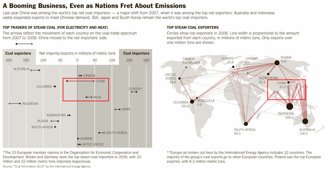 En 2010 el volumen de carbón comerciado en los mercados internacionales fue de unas 1.110 millones de toneladas métricas (MTm). Este mismo año las importaciones chinas fueron de 165 MTm, las japonesas de 110 MTm y las de India de 75 Mm. Es decir, los tres principales importadores están copando aproximadamente el 33% de todo el carbón exportado. El crecimiento que promedia el volumen exportado de carbón durante el último decenio es de unas 40 MtTm, y en el mejor de los casos los analistas esperan unas 50 MTm.