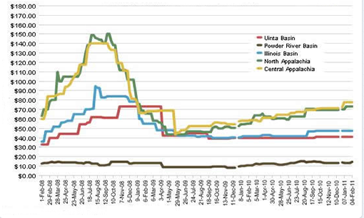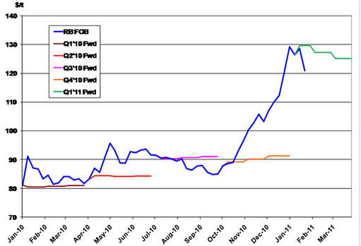 Según Mcquarie, el 40% de la producción ha quedado paralizada por algún tipo de contratiempo en la extracción, tratamiento o transporte. Lo que ha provocado que el carbón de más calidad en Queensland cotizara en enero hasta los 385$/Tm, un 70% más caro que el trimestre anterior.