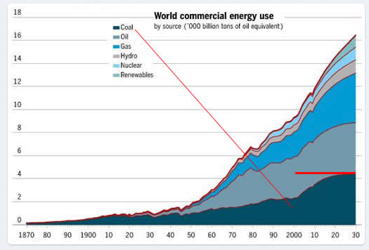 Este estudio del GVSt fue corroborado a su vez por British Petroleum (BP). En su importante informe BP Nergy Outlook 2030, publicado en enero de este año, se aprecia claramente que a partir de 2030 no podrá aumentar la producción mundial de carbón. Así que necesariamente el desarrollo eléctrico sólo podrá llegar mediante renovables, uranio en menor medida y, finalmente, por el gas natural a gran escala.