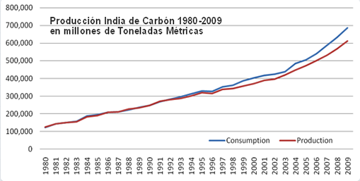 El caso de India es más grave si cabe. Porque con un consumo de 1/5 aproximadamente sobre el que tiene China, ya está importando carbón de los mercados exteriores en cantidades cada año mayores, pues el desarrollo de su minería es incapaz de seguir el ritmo de la demanda interna. La brecha en 2010 fue de unos 70 MTm.