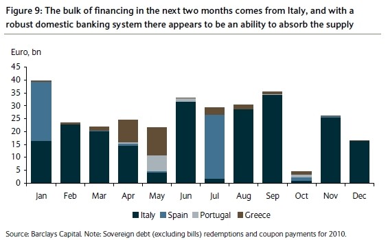 “La próxima ronda significativa de financiación para Grecia llega en abril”, pero el mercado “se enfrenta a otro obstáculo significativo en julio” debido a las necesidades financieras del Gobierno español. En concreto, el próximo julio el Tesoro tiene que colocar en el mercado cerca de 25.000 millones de euros de deuda pública -las necesidades totales de financiación superan los 225.000 millones para el conjunto del año-.