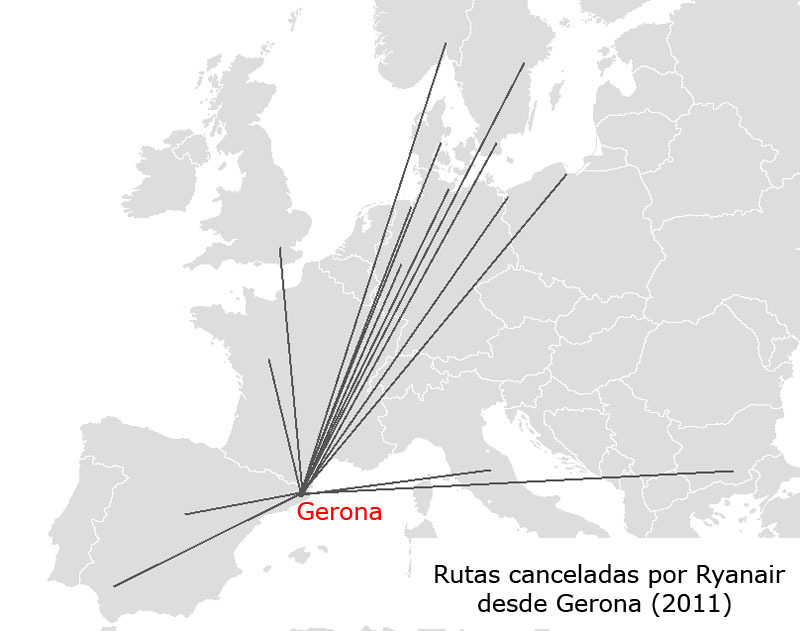 El anunció ha corrido a cargo del vicepresidente de la aerolínea, Michael Cawley. Las 18 rutas canceladas unen Gerona con Aarhus, Dusseldorf, Danzig, Estocolmo, Hamburgo Lübeck, Ibiza, Kristianstad, Lanzarote, Lille, Londres-Gatwick, Madrid, Oslo, Perugia, Plovdiv, Poitiers, Sevilla, Stettin y Tenerife Sur.