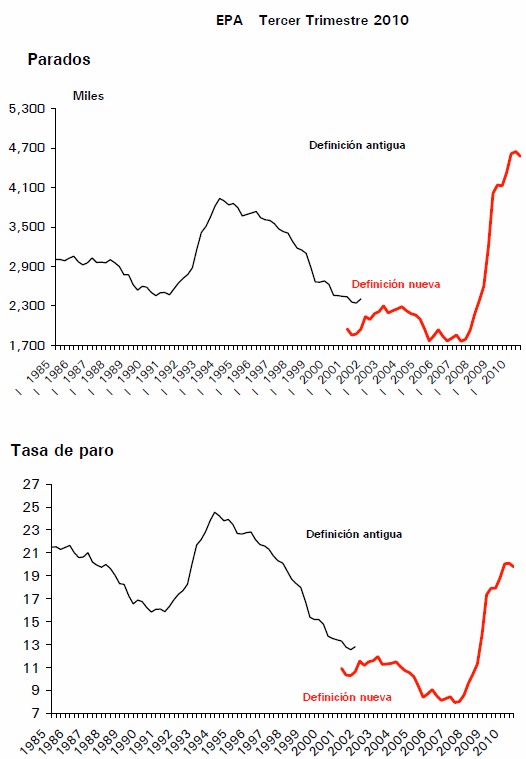 El Instituto Nacional de Estadística (INE) también elabora ambos datos. La Encuesta de Población Activa (EPA) del tercer trimestre, publicada este viernes, indica que la tasa de paro en España baja hasta el 19,8% frente al 20,1% del segundo trimestre, lo cual se materializa en 70.800 parados menos. Se trata del primer descenso desde el tercer trimestre de 2009, cuando bajó en 14.200 personas.