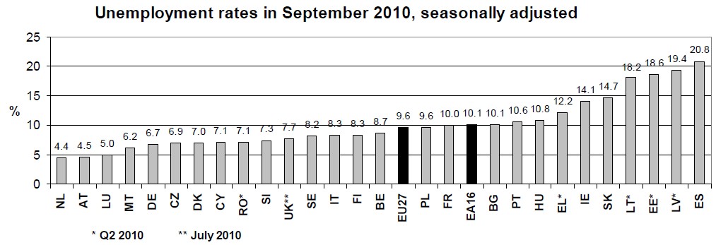 De hecho, la situación empeora si se toma como referencia el desempleo desestacionalizado que elabora Eurostat (oficina estadística de la UE), publicado este viernes, y que ofrece datos homogéneos a nivel comunitario: el paro escaló hasta el 20,8% el pasado septiembre, seis décimas más que el pasado junio (20,2%). España sigue, pues, liderando el paro de la UE-27. Además, la situación es dramática si se atiende a la situación de los jóvenes (menores de 25 años): desempleo del 42,5%, dos puntos porcentuales más que hace un año.